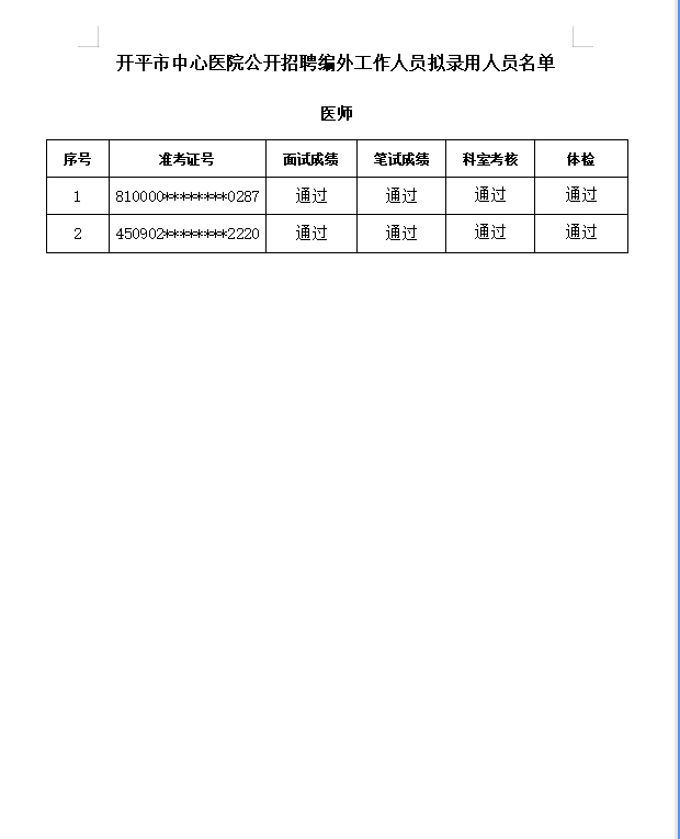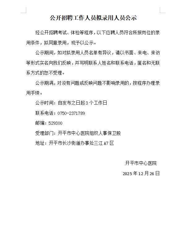 公开招聘工作人员拟录用人员公示
