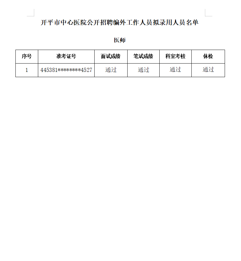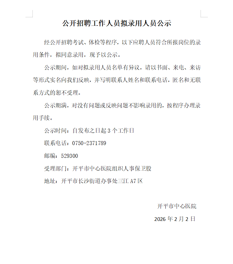 公开招聘工作人员拟录用人员公示