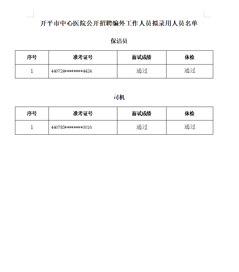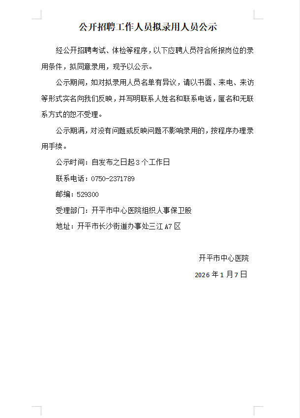 公开招聘工作人员拟录用人员公示